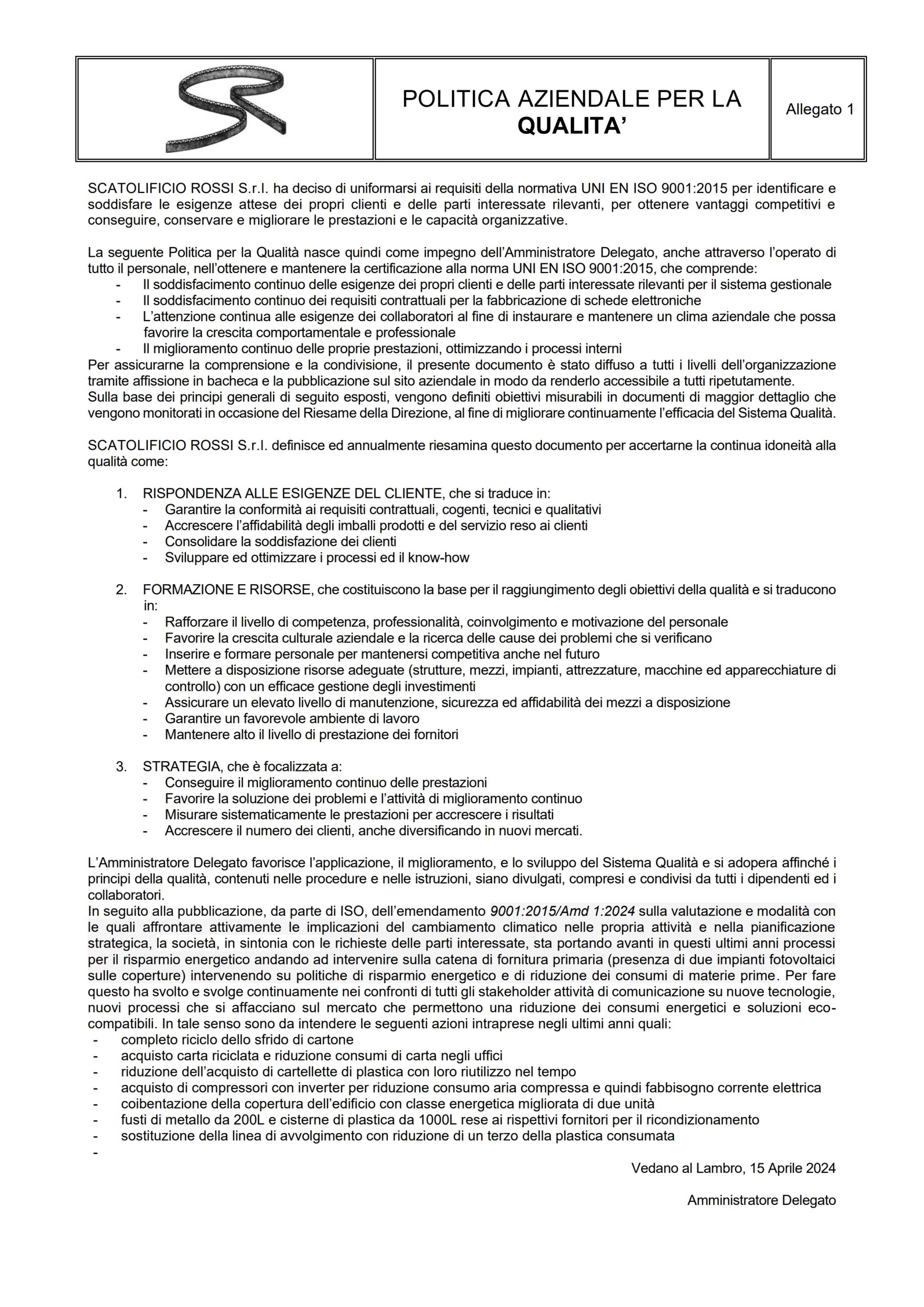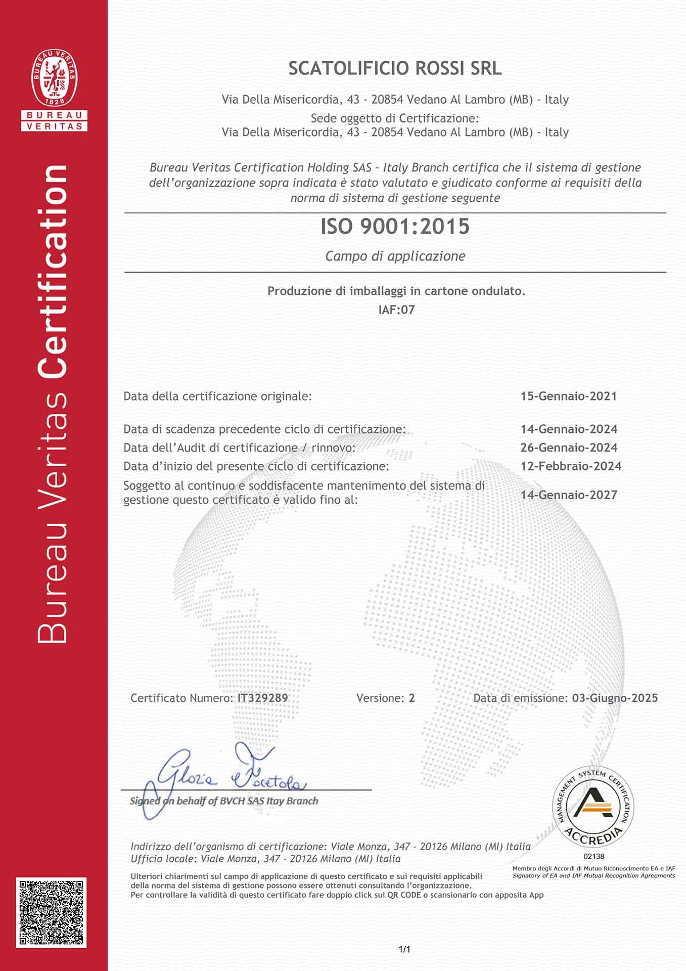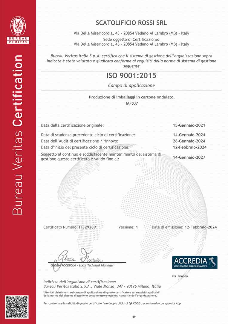 Scatolificio Rossi ha ottenuto nel 2020 la Certificazione ISO 9001:2015, che garantisce da parte dell’azienda la ricerca della qualità in ogni aspetto della propria attività: dal modo di operare, ai livelli di servizio garantiti al cliente, fino ai prodotti forniti.