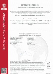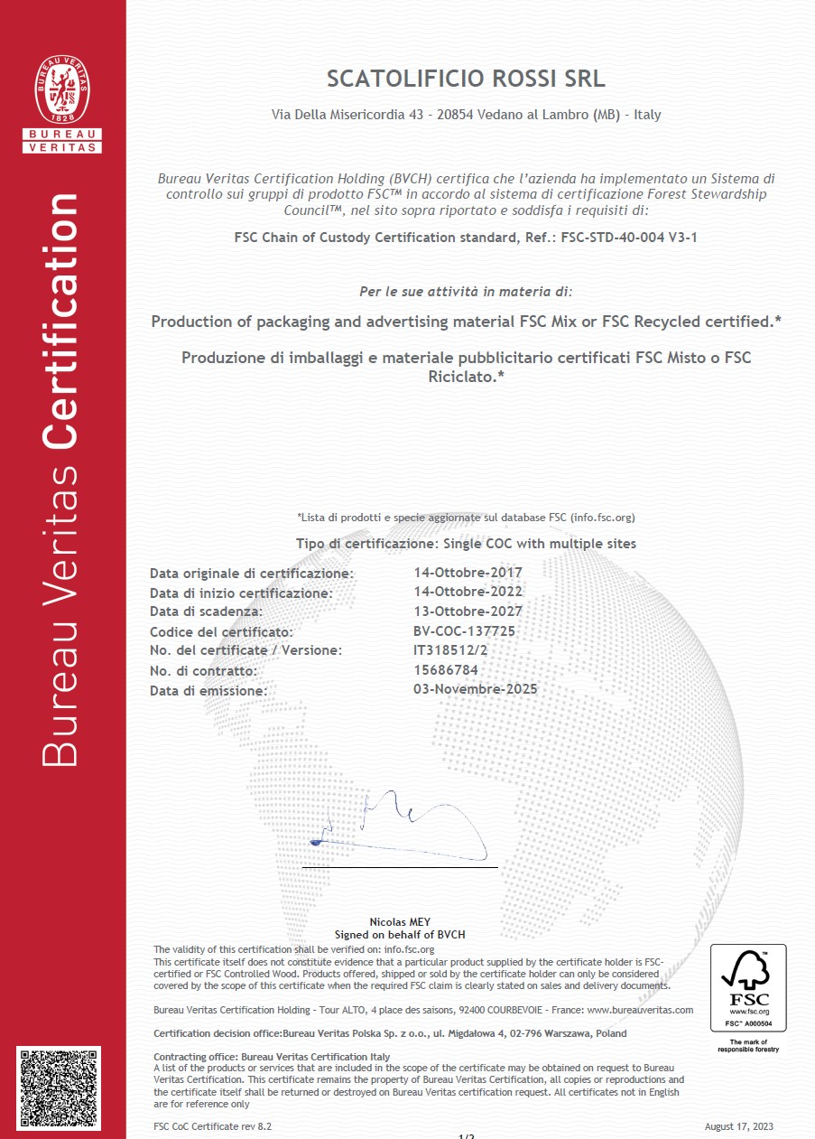 Scatolificio Rossi ha ottenuto nel 2017 la Certificazione FSC® (Certificazione di Catena di Custodia) che garantisce che i materiali utilizzati per i prodotti sono stati approvvigionati in modo responsabile.